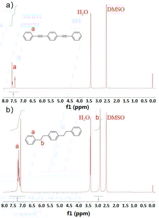 1H NMR spectra of (a) 1,4-diphenylethynyl benzene (DEB) and (b) hydrogened 1,4-diphenylethynyl benzene (H-DEB).