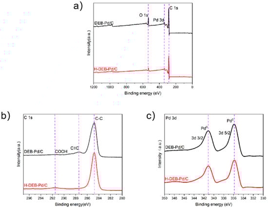 (a) XPS full scanning spectrograms of Deb-PD/C and H-DEB-Pd/C; (b) C 1s spectrogram; (c) Pd 3d spectrogram.