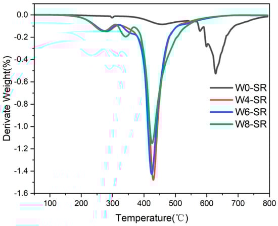 DTG curves of W0-SR, W4-SR, W6-SR, and W8-SR.