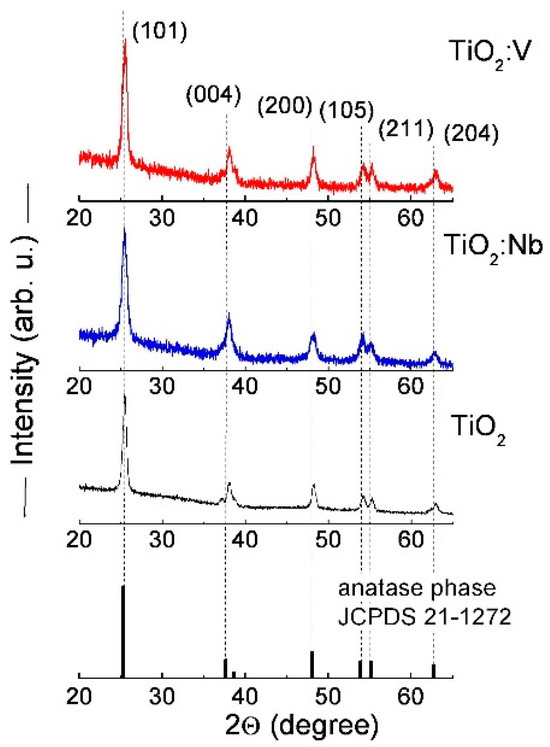 The position of the peaks slightly varies related to the pure sol-gel TiO2 sample and they are situated as single peaks around ~25.5°, ~38.1°, ~48.2° and ~62.9° and as a double peak around ~54.2° and ~55.2°. All correspond to the TiO2 anatase phase with a tetragonal structure and I41/amd (141) space group according to the XRD reference card JCPDS 21-1272 [36]. The corresponding crystal planes of (101), (004), (200), (105), (211) and (204) are indicated in Figure 1. The broad peaks are evidence of the nanocrystalline structure with small-sized crystallites. Although no peaks related to Nb- or V-oxide phases were detected, the successful incorporation of these metal atoms was verified by XPS measurements, which indicated the presence of Nb5+ and V5+ states in the titania lattice [28,32].
