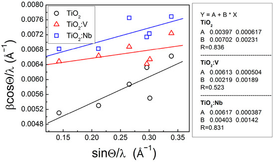 Williamson–Hall plots for the sol-gel pure and doped with Nb(V) TiO2 multilayers. The equation of the linear fit Y = A + B × X is inserted.