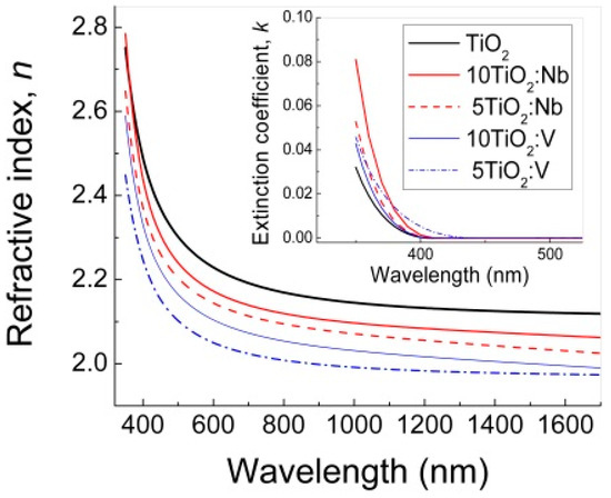 Dispersion curves of the refractive index n and extinction coefficient k (inserted) of pure and Nb(V) doped TiO2 multilayers.
