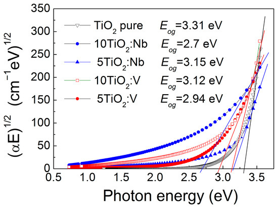 The extinction coefficient values became negligible above λ~450 nm, testifying for good transparency in the visible spectral range (Figure 3). For the doped layers, the dispersion curves moved toward smaller energies (longer wavelengths), suggesting a narrowing in the TiO2 energy bandgap, Eog. Considering that indirect electron transitions occur, the Eog was evaluated from the absorption coefficient α (α = 4πk/λ), building the Tauc’s plots (αE)1/2 versus photon energy E and extrapolating the linear part of the curves toward zero absorption [43]. The interception of this line with the E-axis provided the Eog values with an accuracy of ±0.05 eV. The corresponding Tauc’s plots are given in Figure 4.