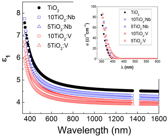 Optical dielectric constant ε1 versus wavelength λ of pure and Nb(V)-doped TiO2 multilayers. In the insert, the optical conductivity σ values versus λ for the studies films are presented.