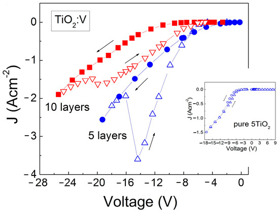 In Figure 6, the I-V characteristics of V-doped TiO2 films are illustrated as the current density J = I/s is plotted against the voltage applied to the Al-dot contact on the oxide surface. The current at a positive voltage remains consistently below 10−7 A, giving rise to a strong asymmetry between the J values at positive and negative voltage values. A similar behavior was registered in the pure TiO2 (inserted in Figure 6) and Nb-doped TiO2 films as well.