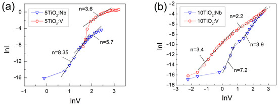 The specific resistivity, ρf, was calculated from the I-V characteristics, measured under the forward bias at higher voltages, from the resistivity R being equal to R = ΔV/ΔI and ρf = Rs/df, where ∆V and ∆I are the differential voltage and current values, df is the film thickness, and s is the dot contact area. The calculated ρf values are given in Table 3. As can be seen, ρf is in the order of 104 Ωcm. Such large specific resistivity values can be a result of charge compensation taking place, as previously reported by Baumard et al. [46]. The high resistivity values, as well as the implied presence of charge traps in the film, indicate that space charge limited current occurs. This can be checked by determining the value of n from the I~Vn dependence. By plotting the lnI versus lnV graphs (Figure 7), the obtained n values are higher than 2, regardless of the dopant type used. Such values of n indicate that the forward current is space charge-limited current via deep levels with different energies in the TiO2:Nb(V) energy gap.