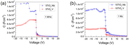 The 1 MHz C-V characteristics are presented in Figure 8. In all cases, at a reverse direction, when positive voltage is applied to the oxide surface, the capacitance values decrease, indicating that the thickness of the space charge layer formed at the Si-TiO2:Nb(V) interface increases at these voltages. For negative voltages (forward direction), the thickness of the space charge layer decreases, which is reflected in the increase in the measured capacitance at these voltages.