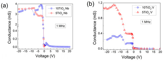 G-V characteristics of MIS structures with TiO2:Nb (a) and TiO2:V (b) films.