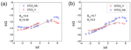 lnG versus lnf plot of MIS structures with 5TiO2:Nb(V) (a) and 10TiO2:Nb(V) (b) films. The frequency values are in kHz.