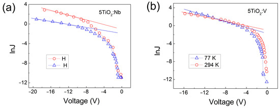 For V-doped films (Figure 11b) the current densities at both temperatures are similar, indicating that the electron transport in these films is tunneling-type conduction. The same mechanism is valid for the Nb-doped films but only down to −5 V (Figure 11a). Below −5 V, the conductivity at 294 K becomes greater than that at 77 K. This points out that thermally activated conduction occurs in the Nb-doped layers under these conditions. In the case of thermally activated conduction, electrons hop from occupied energy levels to adjacent empty ones.
