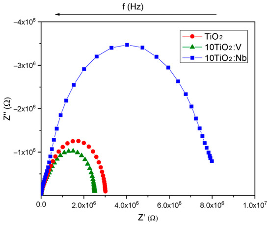 For the 5TiO2:Nb (Figure 11a), the activation energy is equal to qφa = 17–19 meV, while for the 5TiO2:V (Figure 11b), it is equal to qφa = 14–19 meV, which is definitively lower than the room temperature value of kT~25 meV and, therefore, the main contribution to the electron transport at both 77 and 294 K temperatures is accomplished by the electron tunneling from the occupied levels to the nearest empty ones in the TiO2 energy bandgap; in other words, the electrons move by inter-trap tunneling.