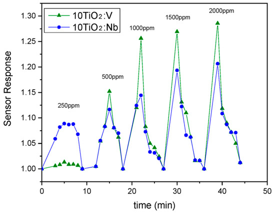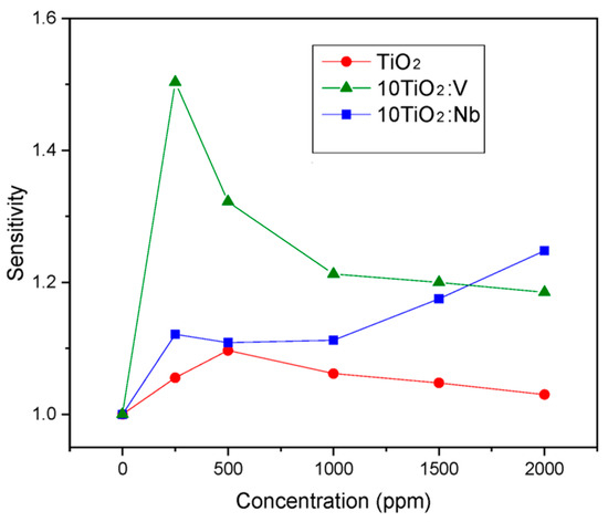 - Zeng, W.; Liu, T.; Wang, Z. Impact of Nb doping on gas-sensing performance of TiO2 thick-film sensors. Sens. Actuators B Chem. 2012, 166–167, 141–149. [Google Scholar] [CrossRef]