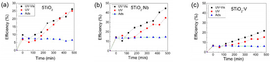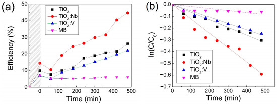 The testing of sol-gel doped and undoped TiO2 films as photocatalysts for the removal of MB from water under UV–Vis irradiation revealed that the photocatalytic efficiency of a Nb-doped TiO2 thin film was nearly twice as high as that of pure or V-doped TiO2, making the TiO2:Nb thin films the most promising for up-scaling.