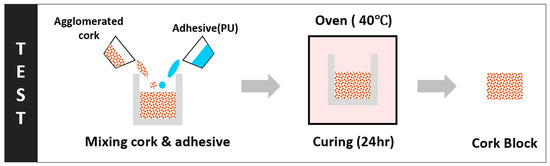 Mix mass ratios of both cork (2–3 mm, Amorim Cork, Santa Maria de Lamas, Aveiro, Portugal) and the two-part colourless polyurethane elastomer (WC565, Barnes, New Zealand) were carefully measured using precision scales prior to mixing at the predetermined binder/cork mix mass ratios given in Table 1, as shown in the schematic diagram of the preparation process (Figure 1).