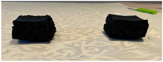 For benchmarking purposes, expanded polystyrene test specimens of identical size to those produced though compression moulding of PU and cork, shown in Figure 4, were extracted from a commercially available e-scooter helmet. These benchmarking specimens were then prepared for testing in the same manner as previously described for the PU/cork test samples.