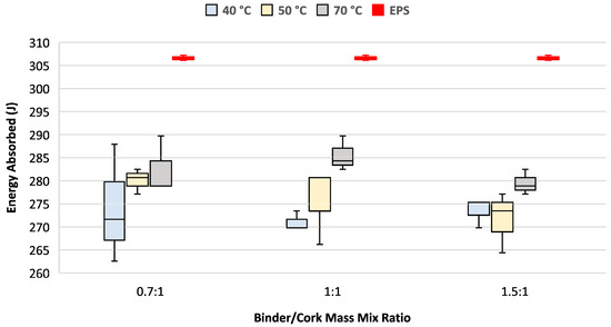 A higher curing temperature was found to increase the amount of energy absorbed by each of the test samples independently of the binder/cork mix ratio, as shown in Figure 7. Increasing the binder/cork mix mass ratio did not change the mean energy absorption but produced more consistent results between the test samples.