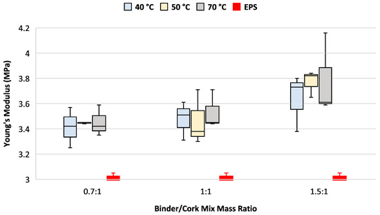 All variations of the binder/cork mix mass ratio and curing temperature tested demonstrated between a 9.8% and 24.6% higher Young’s modulus of elasticity compared to EPS.