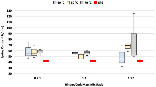 All PU/cork test samples demonstrated higher levels of stiffness, with medians ranging from 9.8% to 24.6% greater than those found for the EPS sample. Analysis of these results found that the elastic constant levels generally increased with increasing PU/cork mix mass ratios tested across all curing temperatures. The most elastic samples used the lowest amount of PU binder, having a 0.7:1 PU/cork mix mass ratio and curing temperatures ranging from 40 °C to 70 °C. While in our study, increasing curing temperature over the range tested produced no significant differences in the elastic modulus, another study has shown that increasing curing temperatures beyond 70 °C would lower Young’s modulus of elasticity [18] so that it becomes closer to that of EPS.