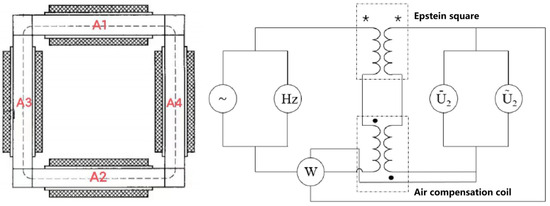 At present, the commonly used methods for magnetic property testing include Epstein’s square circle method, the monolithic method and the ring sample method. The most popular method is Epstein’s square circle method. Figure 2 shows the principle of Epstein’s square circle method. The test principle of Epstein’s square circle is similar to that of a no-load transformer, which contains four groups of coils, and each group of coils has an excitation winding and a measurement winding, which are connected in series, respectively, In Figure 2, the dotted terminal of the excitation winding and the measurement winding of the square coil are denoted by *. At the same time, in order to reduce the influence of air between windings on the measurement results, the air compensation winding are reversed in series, and the dotted terminal of the air compensation winding are represented by black dots in Figure 2. When a certain frequency of AC voltage is applied to the excitation winding, the induced voltage will be generated in the measurement winding. By detecting the magnitude of the induced voltage, the magnetic properties of the measured material, such as the magnetic flux density and iron loss, can be calculated. During the test, in the form of a double lap, the silicon steel sheet in the rolling direction is placed in A1 and A2 for testing, and the silicon steel sheet perpendicular to the rolling direction is placed in A3 and A4 for testing. And then, a square closed magnetic circuit is formed. The principle of the magnetic property testing of the monolithic method is similar to that of the Epstein method, so this manuscript will not discuss it. The test samples for both testing methods are in the form of monolithic, and the magnetic circuit is not circular.