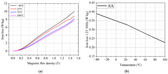 - When the temperature increases, the iron loss reduction degree of the AA is also significantly greater than that of the ST100. After the temperature increases from −40 °C to 100 °C, the iron loss reduction degree of the AA and ST100 is 5.27% and 38.37%, respectively. The separation results of the iron loss coefficient show that the iron loss coefficient of the AA and ST100 changes less with the frequency and more with the temperature, and the iron loss coefficient of the AA changes much more with the temperature than that of the ST100. The simulation results of the iron loss of the motor model verify that the iron loss of the teeth of the AA motor will be significantly reduced when the temperature rises. The more novel and detailed motor simulation ideas proposed in this manuscript can provide practical reference for the design of AA motors. In subsequent research, the sensitivity of the AA’s magnetic properties to mechanical stress will be explored, and the effect of temperature on the AA’s magnetic properties as studied in this paper will be combined to explore the variation law of the AA’s magnetic properties under the condition of multiple physical fields. Based on this, the forward design of an AA motor under the coupling effect of multiple physical fields will be carried out.