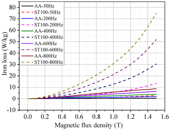 Iron loss of AA and ST100 at different test frequencies (temperature = 23 °C).