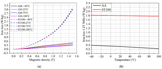 Figure 9a shows the iron loss comparison of the ST100 and AA at different temperatures when the test frequency is 50 Hz. It can be seen from Figure 9a that, taking the test point with a magnetic flux density of 1.5 T as an example, when the temperature rises from −40 °C to 100 °C, the iron loss of the ST100 decreases from 3.152 W/kg to 2.986 W/kg. The iron loss of the AA is reduced from 0.490 W/kg to 0.302 W/kg, which is reduced by 38.37%. Figure 9b shows the iron loss of the ST100 and AA at different temperatures when the test frequency is 50 Hz and the magnetic flux density is 1.2 T. It can be more intuitively seen from Figure 9b that the iron loss of the AA has an approximately linear relationship with the temperature, which is similar to the law of magnetic flux density and temperature change of the AA described in Figure 8b above. At the same time, by observing the respective slopes of the two curves, it is easy to see that the iron loss of the AA is much more sensitive to the temperature change than that of the ST100. This is because the magnetic domain structure of the AA is more complex and unstable, which can be easily rearranged and changed by temperature change, resulting in a large decrease in iron loss with a temperature increase. However, the magnetic domain structure of the ST100 is orderly and stable, and it is not relatively easy to change under the influence of temperature, so the change degree of iron loss with the increase in temperature is small. In addition, the accuracy of the iron loss test results of soft magnetic materials will directly affect the accuracy of the motor efficiency simulation and temperature rise simulation in the process of motor design. Therefore, in the process of designing an AA permanent magnet synchronous motor, in order to accurately determine the core loss and efficiency of the motor in the actual operation process, it is also very important to consider the influence of the temperature change on the iron loss characteristics of the AA.