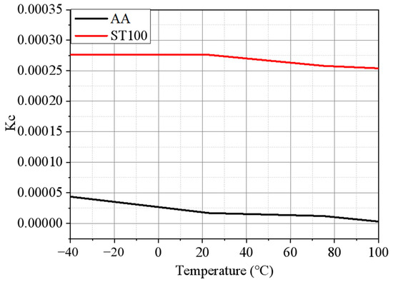In Figure 10, the variation trend of the eddy current loss coefficient of the two materials at different temperatures can be seen more intuitively. It is easy to see that the eddy current loss coefficient of the ST100 changes very little with the temperature before about 40 °C, and decreases with the increase in temperature after 40 °C. The eddy current loss coefficient of the AA decreases rapidly with the increase in temperature in the whole temperature interval. The relationship between the eddy current coefficient of the AA and the temperature is similar to a linear negative correlation, and the eddy current loss coefficient of the AA decreases about 13.30% when the temperature increases by 20 °C. Therefore, from the extent to which the eddy current loss coefficients of the two materials change with the temperature, it can be seen that the temperature sensitivity of the iron loss characteristics of the AA is much greater than that of the ST100, which is mutually consistent with the conclusion drawn in the previous section.
