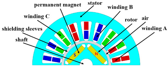 Figure 11 shows the PMSM model proposed in this paper. The pole slot ratio of the motor is 4 poles and 18 slots. The rotor part of the motor adopts a built-in structure. Because the processing of the AA is difficult, the rotor material is B25AHV1300, and the stator part is AA or ST100. The magnetic field line direction of the N-pole magnetic steel is the direction of the magnetic steel pointing to the winding, while the magnetic field line direction of the S-pole magnetic steel is the direction of the winding pointing to the magnetic steel. After passing through the stator and rotor core and winding in the middle, a closed magnetic circuit is formed. Because of the special use of this motor, a shielding cover should be added between the stator and the rotor to isolate the stator from the air gap. The rated speed of the motor is 21,000 rpm and the peak speed is 25,000 rpm. The main performance parameters of the motor are shown in Table 4.