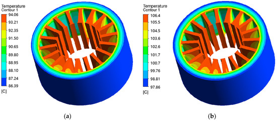 Figure 12 shows the thermal simulation results of the permanent magnet synchronous motor in this paper. Since the material replacement in this paper is aimed at the stator, only the thermal simulation work of the motor stator is carried out. Because the iron consumption of the AA and ST100 is easily affected by the temperature, the iron consumption and temperature rise are coupled. The coupling relationship makes the thermal simulation of motor involve the iterative treatment of the material properties and motor temperature rise, which increases the difficulty of the motor thermal simulation. The Fluent module of the Ansys finite element simulation software supports the iterative thermal simulation function of the temperature rise and material properties. Therefore, the Fluent module of Ansys is used in this paper for the thermal simulation work of the AA motor and ST100 motor. As can be seen from Figure 12, the AA motor and ST100 motor both produce a very high temperature rise during operation, and there is a huge gap between the iterative and non-iterative temperature rise simulation results. The maximum temperature rise after the iteration of the ST100 motor is 11.4 °C higher than that without iteration, while the maximum temperature rise after the iteration of the AA motor is 11.6 °C higher than that without iteration. Moreover, by comparing the temperature rise of the AA motor and ST100 motor, it can be found that the highest temperature of the AA motor after the iterative thermal simulation is 106.4 °C, which is lower than the 136.9 °C of the ST100 motor. This not only validates the conclusion in Section 3 that the iron loss of the AA is much lower than that of the ST100 but also indicates that the influence and importance of iterative processing in the thermal simulation of the AA motor is greater.