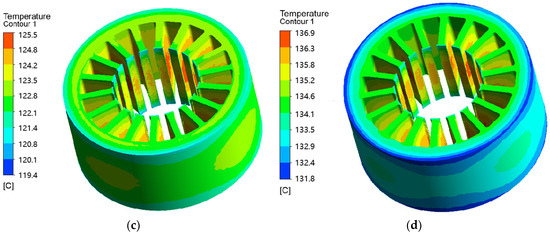 Temperature rise cloud image of AA and ST100 motors: (a) AA-no iteration; (b) AA-iteration; (c) ST100-no iteration; and (d) ST100-iteration.