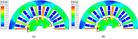 Figure 13 shows the magnetic flux density distribution of the ST100 motor and AA motor at 23 °C and 100 °C, and the material magnetic property data of the motor model at each temperature are the data measured at the corresponding temperature in Section 3. The results show that the magnetic flux density of the ST100 motor almost does not change with the change in temperature, and it has good temperature stability. However, it can be seen from the magnetic flux density distribution of the AA motor that the magnetic density of the teeth at 23 °C is greater than that at 100 °C. This mutually supports the conclusion in Section 3 that the temperature sensitivity of the magnetic flux density of the AA is greater than that of the ST100. It also shows that the effect of temperature on the magnetization of the AA cannot be ignored in the process of AA motor design.