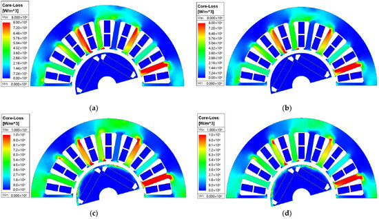 Iron loss distribution of AA and ST100 motors at different temperatures: (a) ST100-23 °C; (b) ST100-100 °C; (c) AA-23 °C; and (d) AA-100 °C.