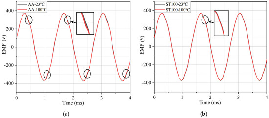 Figure 15 shows the load back electromotive force waveforms of the motors made of the two materials at 23 °C and 100 °C. It can be seen that the change degree of the back EMF of the motors made of the two materials with the temperature is different and the sinusoidal property of the back EMF of the AA motor is significantly worse with the increase in temperature, while the deterioration degree of the back EMF of the ST100 motor is smaller with the increase in temperature. This is because the AA is more sensitive to temperature than the ST100 material. With the increase in temperature, the shape of the magnetization curve of the AA changes greatly, which has an adverse effect on the back EMF of the AA motor.