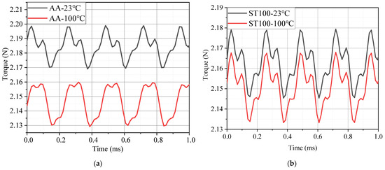 Figure 16 shows the rated torque waveforms of the motors made of the two materials at 23 °C and 100 °C. It can be inferred from the test results of the magnetic properties of the two materials in Section 3 that the saturation flux density of the AA is lower than that of the ST100 silicon steel material, so the stator teeth of the AA motor are more prone to magnetic saturation phenomenon in the same motor, resulting in an increase in magnetic leakage, and ultimately, the rated torque of the AA motor is lower than that of the ST100 motor. However, the actual simulation results show that the rated torque of the AA motor is 1.01% larger than that of the ST100 motor, because the magnetic density of the teeth of the AA motor is about 1.4 T under the rated working conditions and has not reached saturation. According to the magnetization curves of the two materials measured in Section 3, at this time, under the same magnetic field strength, the AA has higher permeability, and the magnetic flux density of the AA is greater than that of the ST100, so the torque of the AA motor is larger. However, after considering the influence of temperature on the magnetic properties, the torque of motors of both materials decreased. According to the magnetic properties test data in Section 3, the magnetic flux densities of the AA and ST100 both changed with the temperature. Therefore, after considering the influence of temperature, the torque of the ST100 motor is reduced by 0.55%, and the reduction degree of the AA motor torque is as high as 1.74%, which is 3.16 times than that of the ST100 motor torque reduction. The average torque of the AA motor is reduced to 2.145 N, which is lower than the 2.151 N of the ST100 motor. Numerically, it will be found that the reduction inf the torque of the AA motor with an increasing temperature is very small in this manuscript, which is due to the low rated torque of the motor in this manuscript. However, if the torque is reduced by only 1.74% in some large torque motors, it will be a large value. If you choose to ignore the influence of the temperature, it may reduce the service life of the motor and even lead to damage. On the other hand, if the working conditions of the designed motor are those of some industrial precision instruments (such as CNC lathes), the torque variation of 1.74% may cause the machined product to fail to meet the requirements. So, it is necessary to consider the effect of temperature when designing a motor with high torque requirements, and to pay more attention to the effect of temperature when choosing an AA as a fixed rotor material. It can be further proved that the temperature sensitivity of the magnetization characteristics of the AA is greater than that of the ST100 by the change in the torque of the two materials with the temperature.