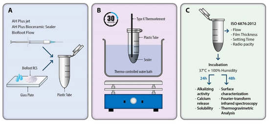 Schematic representation of experimental temperature settings. (A) Distributing sealers in plastic tubes. (B) The temperatures of the sealers were adjusted to 37 °C and 100 °C, maintained for 30 s. (C) Flow, film thickness, and setting time were measured immediately after heat treatment; pH and calcium ion release were evaluated after 24 h cure at 37 ± 1 °C with 95% relative humidity; and surface analysis, FT-IT, and TGA were evaluated after 48 h set under the same conditions.