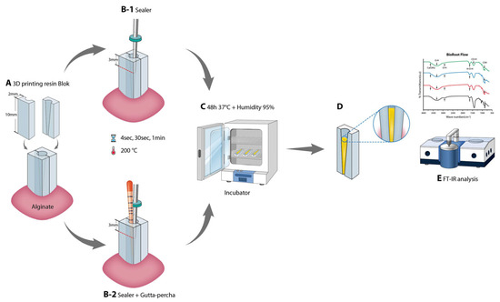 FT-IR is typically conducted by placing sealers in an oven and adjusting the external temperature to 100 °C [24,25]. However, to simulate the clinical environment, we used three-dimensional printed root-canal models (10 mm in height with a taper of 0.2 mm). For the experiment, the root-canal models were manufactured separately for later removal (Figure A), and the heat was directly applied to the sealers in the root canal using a System B heat source (Analytic Technology, Redmond, WA, USA). In one group, only the sealer was applied to the root-canal model, whereas in the second group, both the sealer and gutta-percha (Easyinsmile, Staten Island, NY, USA) were applied. In accordance with the manufacturer’s instructions, the sealer was mixed before placement, and the gutta-percha cone (#30 with a taper of 0.06 mm, cut to a length of 20 mm) was then slightly coated with sealer mixture and slowly inserted into the root-canal model (Figure 2B). System B was set to 200 °C, and the tip was inserted into the root canal to a depth of 3 mm under continuous heating. The pressure was maintained for 4 s, 30 s, and 1 min. A 0.08 mm tip was used in System B. The samples were cured in an incubator with 95% relative humidity and at 37 ± 1 °C for 48 h (Figure 2C). Using the FT-IR (Vertex-70V; Bruker, Karlsruhe, Germany) in an attenuated total reflectance mode with a spectral resolution of 4 cm−1, the spectrum of the solid component was evaluated with a range of 500–4000 cm−1 in vacuum (Figure 2D).