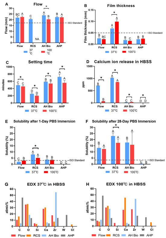 Flow, film thickness, setting time, calcium ion release, solubility, and EDX. (A) The flow at 37 °C and 100 °C. (B) The film thickness at 37 °C and 100 °C. (C) The setting time at 37 °C and 100 °C. (D) The calcium ion released at 37 °C and 100 °C. (E) The solubility after 1 day of immersion in PBS at 37 °C and 100 °C. (F) The solubility after 1 day of immersion in PBS at 37 °C and 100 °C. (G) EDS at 37 °C in HBSS. (H) EDS at 100 °C in HBSS. Different uppercase letters represent significant differences for the other sealers at the same experimental temperature (p < 0.05, A > B > C > D based on mean value). The dashed line represents ISO 6876 cutoff levels. * p < 0.05 (analysis of variance with Tukey’s multiple comparison test, paired t test).