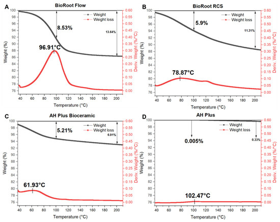 Weight loss (black line) and temperature at which weight loss begins (red line) for four sealers analyzed using TGA. (A) BioRoot Flow, (B) BioRoot RCS, (C) AH Plus Bioceramic, (D) AH Plus.