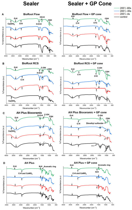FT-IR spectra of sealers with and without gutta-percha at 37 °C (black) and 200 °C for 4 s (red), 30 s (blue), and 60 s (green). (A) BioRoot Flow, (B) BioRoot RCS, (C) AH Plus Bioceramic, (D) AH Plus. All the sealers showed a water O-H absorption band at 3400 cm−1. BioRoot RCS, when heated to 100 °C, Ca(OH)2 spectrum observed at 3646 cm−1 disappeared, the CSBS (A–C) showed a small Ca(OH)2 peak at 3646 cm−1, and a CSH spectrum from 970 to 1000 cm−1. AH Plus (D) exhibited N-H stretching vibration at 1607 cm−1. No chemical changes were detected in all sealers when mixed with gutta-percha.
