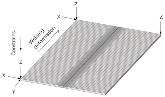 To calculate the deformation of the welded samples, a numerical model with dimensions of 300 mmL × 150 mmW × 4.0 mmT was developed, as seen in Figure 2. To ensure accuracy and to shorten the calculation duration of the simulation, coarse and fine meshes were divided between the interior (coarse) and outer region (fine) of the weld seam [], as seen in Figure 3. In this research, traditional six-node constraints were adopted, as seen in Figure 3. The thermo-mechanical properties of 304L stainless steel are listed in Table 3. The welding deformation was calculated by the FEM software, JWRIAN (V103), which was developed by Osaka University.