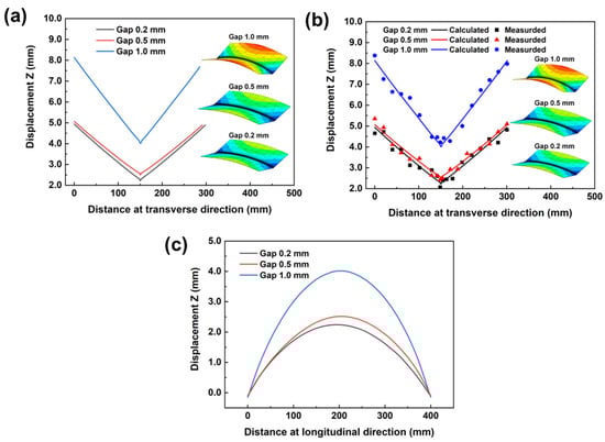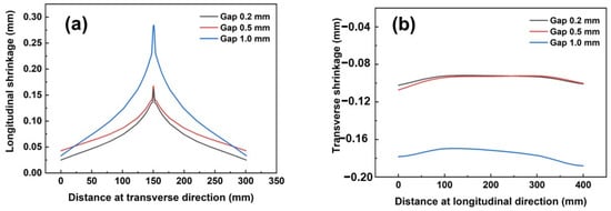 During laser welding, deflection along the Z direction (Displacement Z) was the most important deformation parameter, and its value had great influence on final joint strength []; therefore, Displacement Z was calculated, and the corresponding results are presented in Figure 5. As seen in Figure 5a, it was found that Displacement Z along the transverse direction would become smaller with each reduction in gap distance. The highest value for Displacement Z, of 4.0 mm, was produced at the center of joints with a 1.0 mm gap, and the lowest value, of 2.2 mm, was recorded for joints with a 0.2 mm gap. As reported in a previous publication [], a larger melting zone induces larger welding deformations. According to the fusion zone, as presented in Figure 3, the largest melting zone was produced when a 1.0 mm gap was adopted, which finally resulted in the largest Displacement Z.