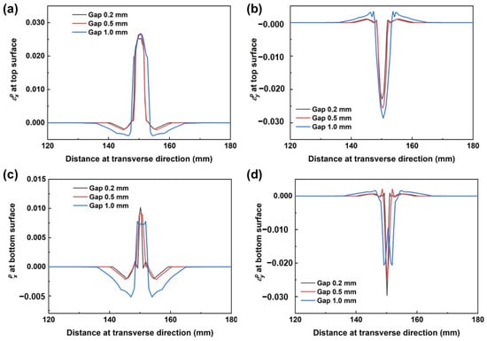To provide a clearer observation of the impact of welding gaps on plastic strain, longitudinal and transverse plastic strains (εpx and εpy) along the surfaces of models were extracted, as illustrated in Figure 7a,b. At the same time, the values of εpx and εpy, along the bottom surface of the model, were also extracted and are illustrated in Figure 7c,d.