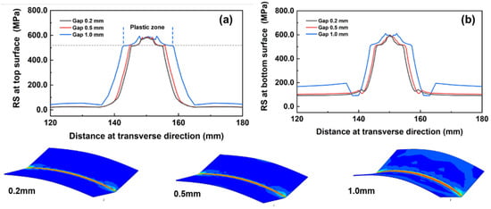 When molten pool was cooled, a material property difference was produced between the fusion zone and basic metals, which induced the generation of residual stress. At this point, differences in the material properties of the fusion zone and base metals were produced. As seen in Figure 5, the joint produced with a 1.0 mm gap demonstrated the largest fusion width in both top and bottom regions. When the welding process was finished, a larger material property difference was produced. During the cooling process, partial elastic strain was recovered, leaving only plastic strain behind. Then, the largest Von Mises stress value level and the widest plastic strain area were both able to be generated, as seen in Figure 8a,b. Under this condition, a larger welding deformation was also produced, as seen in Figure 5. An interesting phenomenon was found when observing the values of SX: SX peak values exceeded the yield strength of 304L stainless steel, and this was caused by the strain hardening.