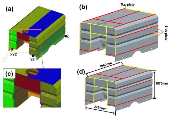 Before the final calculation, some simplifications were implemented: (1) the generated meshes for the model were shells, comprising 75,732 nodes and 782,999 elements. The dimension for the meshes were 35 mm × 35 mm, as seen in Figure 9c. (2) The restrained conditions are shown in Figure 10a. A traditional six-node constraint was adopted. (3) Various structures with little difference in thickness were treated as the same. Under these amplifications, the calculated duration could be shortened and accuracy maintained. For this structure, a total of 24 weld seams were present, which included 10 butt weld seams and 14 corner weld seams.