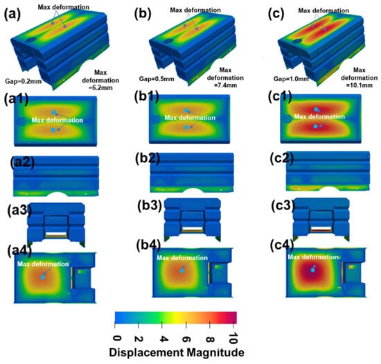Welding deformation for structure with different welding gaps. (a–a4) 0.2 mm, (b–b4) 0.5 mm, (c–c4) 1.0 mm.