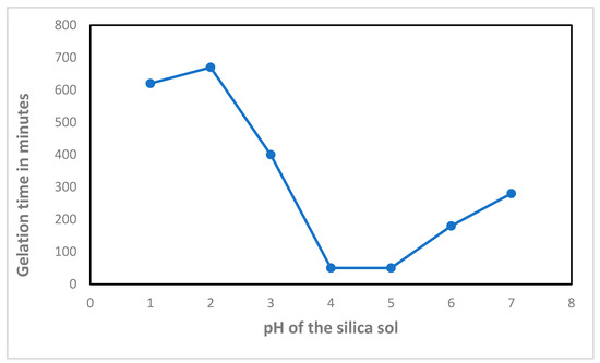 The graph indicates the relationship between the gelation time and the pH effect on silica sol [35].