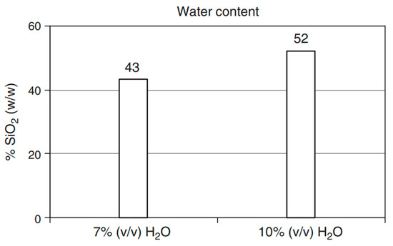 The available information indicates a limited focus on the effect of the water-to-nano silica ratio. Most researchers have concentrated on the H2O/TEOS ratio, with TEOS serving as the source of nano silica. Sequeira et al. conducted a study to explore the impact of tetraethyl orthosilicate (TEOS) and water on the synthesis of cellulose/silica composites via the sol–gel process, using heteropoly acids (HPAs) as catalysts [20] (Figure 7). The study revealed that water molecules had a significant influence on the rate of TEOS hydrolysis, affecting both the hydrolysis and condensation reactions. Increasing the water content from 3.2 to 4.4 mol H2O/mol TEOS (equivalent to 7% and 10% w/w, respectively) promoted the adsorption of silica nanoparticles by cellulose fibres. This effect may be attributed to the increased molecular weight of siloxane polymers resulting from the enhanced alkoxysilane condensation reaction in the presence of higher water molar proportions in the reaction system.