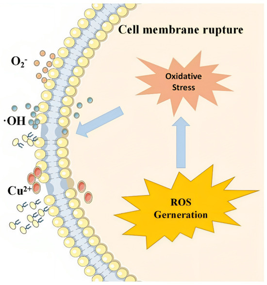 Exploiting the multifaceted advantages of MOFs, various studies have probed their potential in controlling algal proliferation [108,109,110]. For example, Fan et al. [111] showcased the remarkable algae-inhibiting capabilities of Cu-MOF-74, recording a 75.5% removal rate of algae within 120 h. This significant reduction is partially attributed to a 56% decrease in chlorophyll a content, indicating impairment of the photosystem due to diminished chlorophyll a and phycobiliprotein levels. This damage stems from the sustained release of copper ions (Cu2+) from Cu-MOF-74, which serve as a metal ion reservoir, inducing reactive oxygen species (ROS) accumulation within the algal cells. This oxidative stress leads to lipid peroxidation, evidenced by the loss of oxidation balance, decreased superoxide dismutase (SOD) activity, and increased catalase (CAT) activity in the algal cells (Figure 3). In addition, the generation of hydroxyl radicals by Cu-MOF-74 further exacerbates cellular damage, culminating in the death of Microcystis aeruginosa. Consequently, the concentration of extracellular organic matter in the water is observed to rise. These findings illuminate the efficacy of copper-based MOFs, not just as inhibitors but also as agents of removal for harmful algal species.