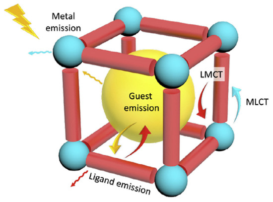 A significant body of early research on MOF-based fluorescence sensors has focused on detecting key pollutants known for their adverse impact on water quality, such as metal ions, anions, and nitroaromatic compounds. These compounds are adept at quenching fluorescence through processes like internal filtering effects (IFE) and photoinduced electron transfer (PET) [113,114]. MOF-based sensors distinguish themselves from other fluorescence sensors crafted from small molecules or conjugated polymers by offering superior chemical tunability, which facilitates precise and efficient host–guest recognition [115,116,117,118,119,120,121,122,123]. Moreover, the inherent structure of MOFs, laden with numerous π and n electrons, is conducive to producing robust and diverse fluorescence signals [124,125,126]. This, combined with their capacity to be easily modified and decorated onto various substrates, positions MOFs as particularly promising candidates for fluorescence-based sensing applications [127,128,129,130,131]. Illustrating their potential, Huang et al. [132] reported on the solvothermal synthesis of an Al3+ MOF, denoted as CAU-1-(OH)2, featuring ligands that strongly coordinate with Bi3+ due to the hydroxyl and carboxyl groups. This affinity of bismuth for oxygen, which is greater than that of the MOF’s metal center, leads to the replacement of Al with Bi, resulting in fluorescence quenching. CAU-1-(OH)2 showcases the ability to detect Bi3+ in water with a remarkably fast response time of 24 s and a detection limit of 2.16 μM. Although its sensitivity to pH may influence detection, this sensor serves as a valuable prototype for future sensor development aimed at Bi3+ and possibly other metal ions [133]. Figure 4 shows the different fluorescence signal sources in MOF-based fluorescence sensors.