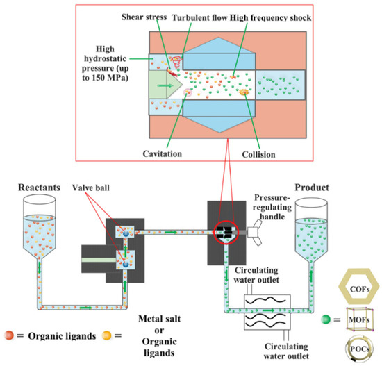 Despite notable advancements in the synthesis and application of MOFs, a key concern revolves around their potential for industrialization and practical applications, particularly in high-volume use cases such as water treatment in environmental applications. Over time, the concerted efforts of material scientists and chemical engineers have optimized the synthesis of functional MOFs, making it more facile and cost-effective [46]. A range of large-scale preparation methods has been developed and considered, encompassing traditional approaches like electrochemical [24], microwave [25] and mechanochemistry [26] approaches and more recent routes like the spray dryer [27], flow chemistry [28] and high-pressure homogenization (HPH) [29]. Within this array of methods, two newly investigated approaches are delineated in the following section.
